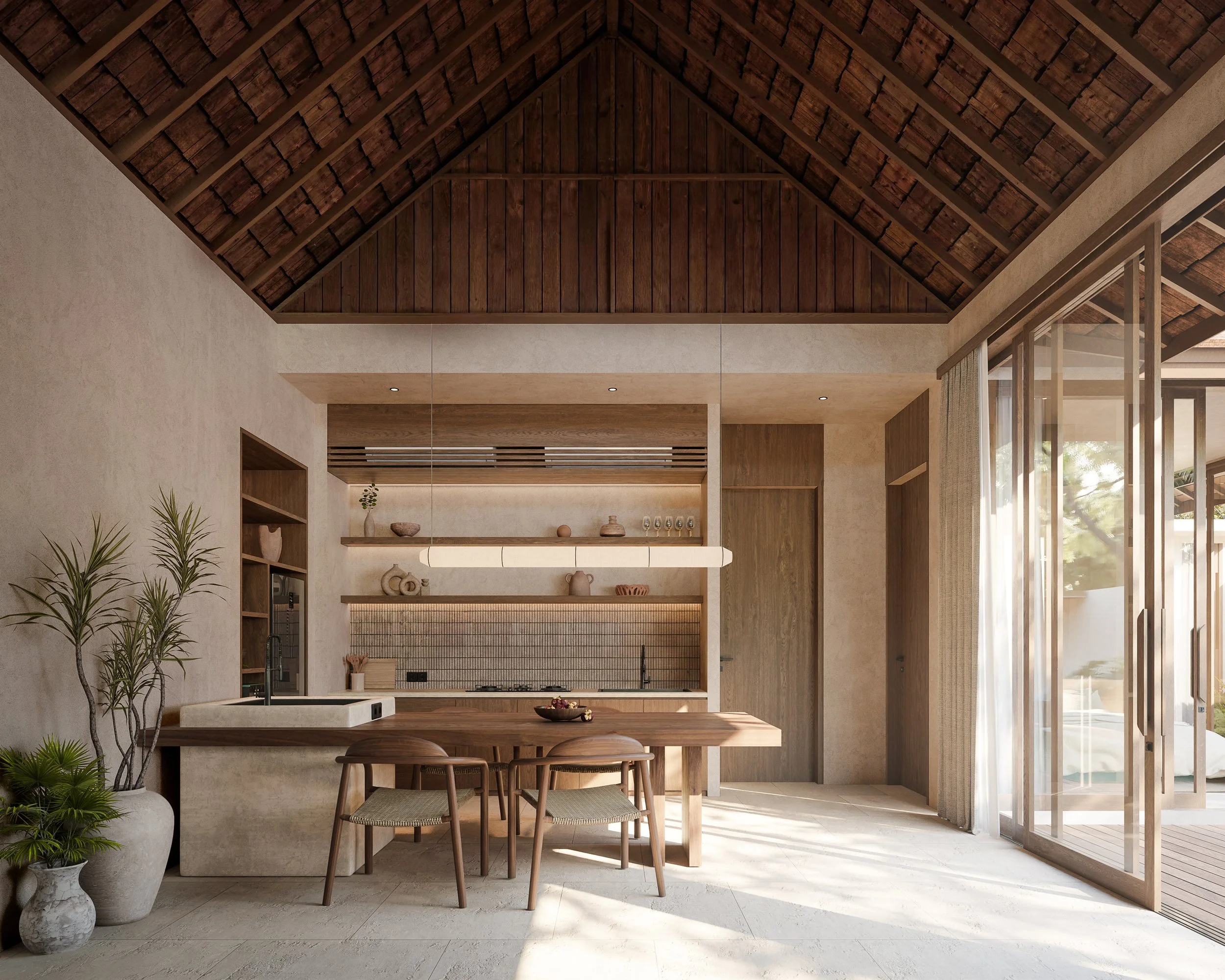 ✱ Two-bedroom villa with open-plan living, dining, and kitchen area.